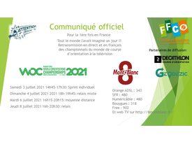 Après l'annonce des championnats de France pédestre Moyenne distance et Sprint diffusés en direct à la Télévision, nous pouvons également annoncer la diffusion par TV8 Mt Blanc des championnats du monde de course d'orientation pédestre avec des commentaires en Français!!
